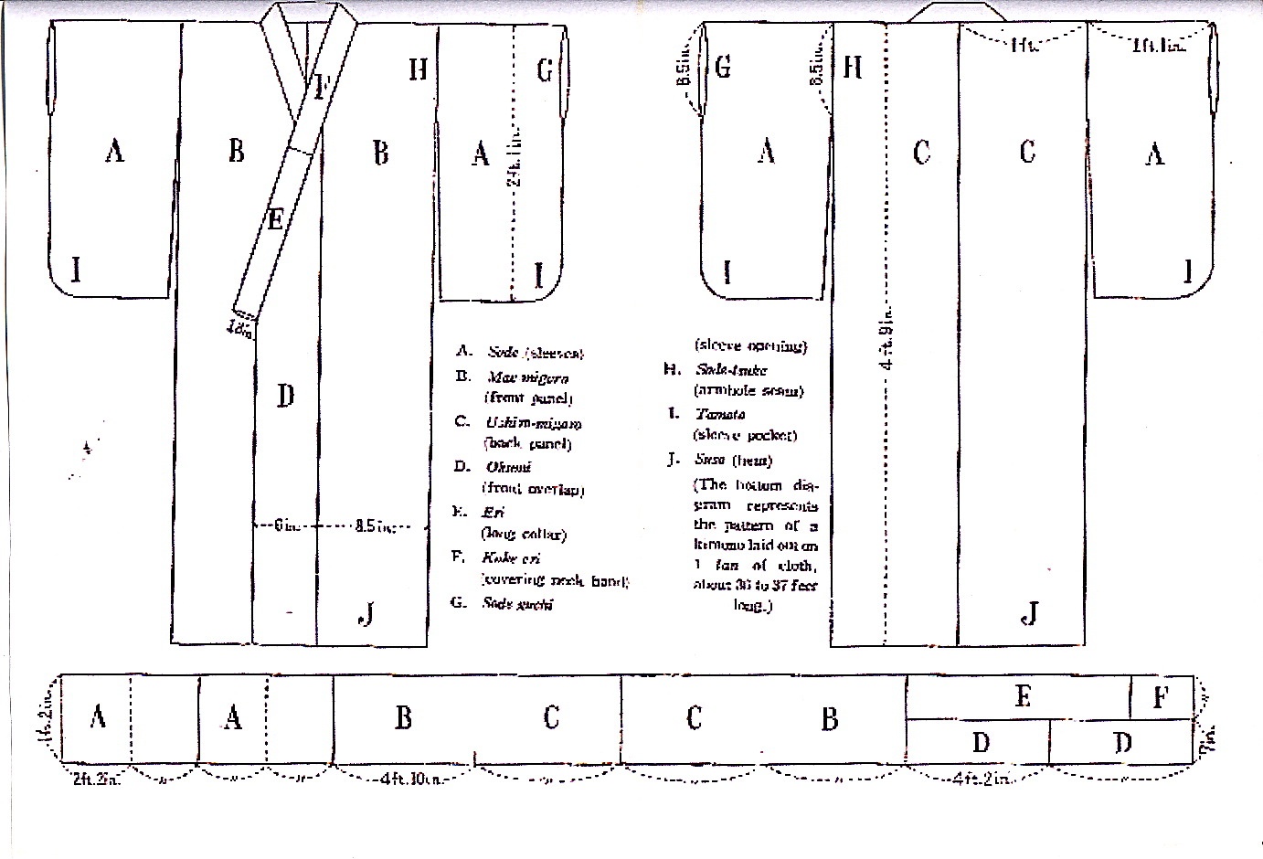 Kimonos har facinerat mig så länge jag kan minnas. Jag har noga studerat böcker om kimonos och dess olika delar och proportioner. Obin (skärpet) är knuten efter alla konstens regler. Till en kimono hör även en underkimono. Jag uteslöt denna , det blev alltför klumpigt i denna lilla skala. Min kimono är sydd i blå-grönt siden med inslag av guldtrådar. Foder och obi i guldfärgat metall-siden. Provdockan är klädd med japanska tecken ur en handarbetstidning.